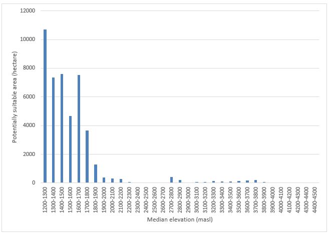 The distribution of the potentially suitable areas with increasing elevation is shown in Figure 3. Almost 95% of the total area is found below an elevation of 2000 masl and between 1200 and 1400 masl circa 18,000 hectares, which equals nearly 40% of the total area of 46,000 ha above 1200 masl.