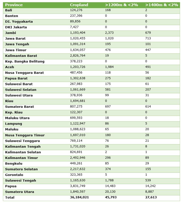 Total cropland area in Indonesia was approximately 36 Mha in 2005 (Fritz et al., 2015). Approximately 28,000 hectares cropland above 1400 masl are potentially suitable for seed potato production according to our approach.