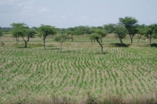 All results are computed per raster cell and illustrated in raster maps (5’ resolution; cell area approx. 86 hectare near the equator). We simulated grain yields (optimally irrigated and rain fed) for each year in the period 1991 – 2010 and compared the average values (n=20) with actual grain yields from 1997 – 2003. We also calculated the lengths of the growing season (expressed as temperature sum) of 1991 – 2010 per raster cell. The median length (n=20) was used to adjust the required temperature sum for maturity of maize in each cell. This assumes that farmers use a maize variety that is adapted to the local conditions and matures on average in time. Annual sowing dates were simulated based on suitable soil moisture and temperature conditions in a predefined sowing window.