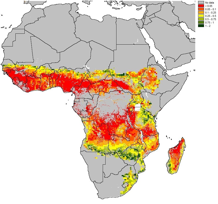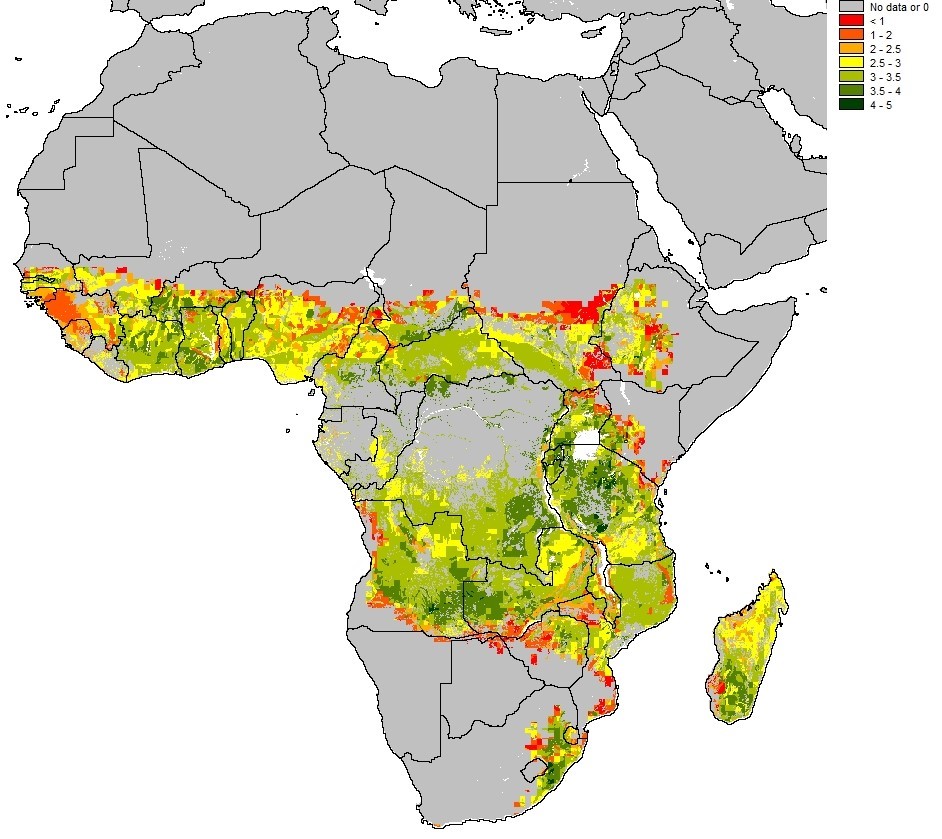 Figure 2 illustrates the large spatial variation in the ratio fertilized (100 kg N ha-1) and actual (viz. ~2000) maize yields, mostly ranging from 1-2 times to more than 5 times. Ratios in Figure 2 are relatively low in countries that already apply fertilizer (e.g. South Africa) and relatively high in countries without (much) fertilizer use (e.g. Côte d'Ivoire). Average yield gap closure, calculated as the ratio of the yield at 100 kg N ha-1 (Fig. 1) and the rain fed potential yield (results not shown), ranges from 0.3 to 0.6 in most cropland areas of Africa with an average of 0.4. This indicates that considerably higher yields are possible in large parts of Africa with higher fertilizer application levels exceeding 100 kg N ha-1.