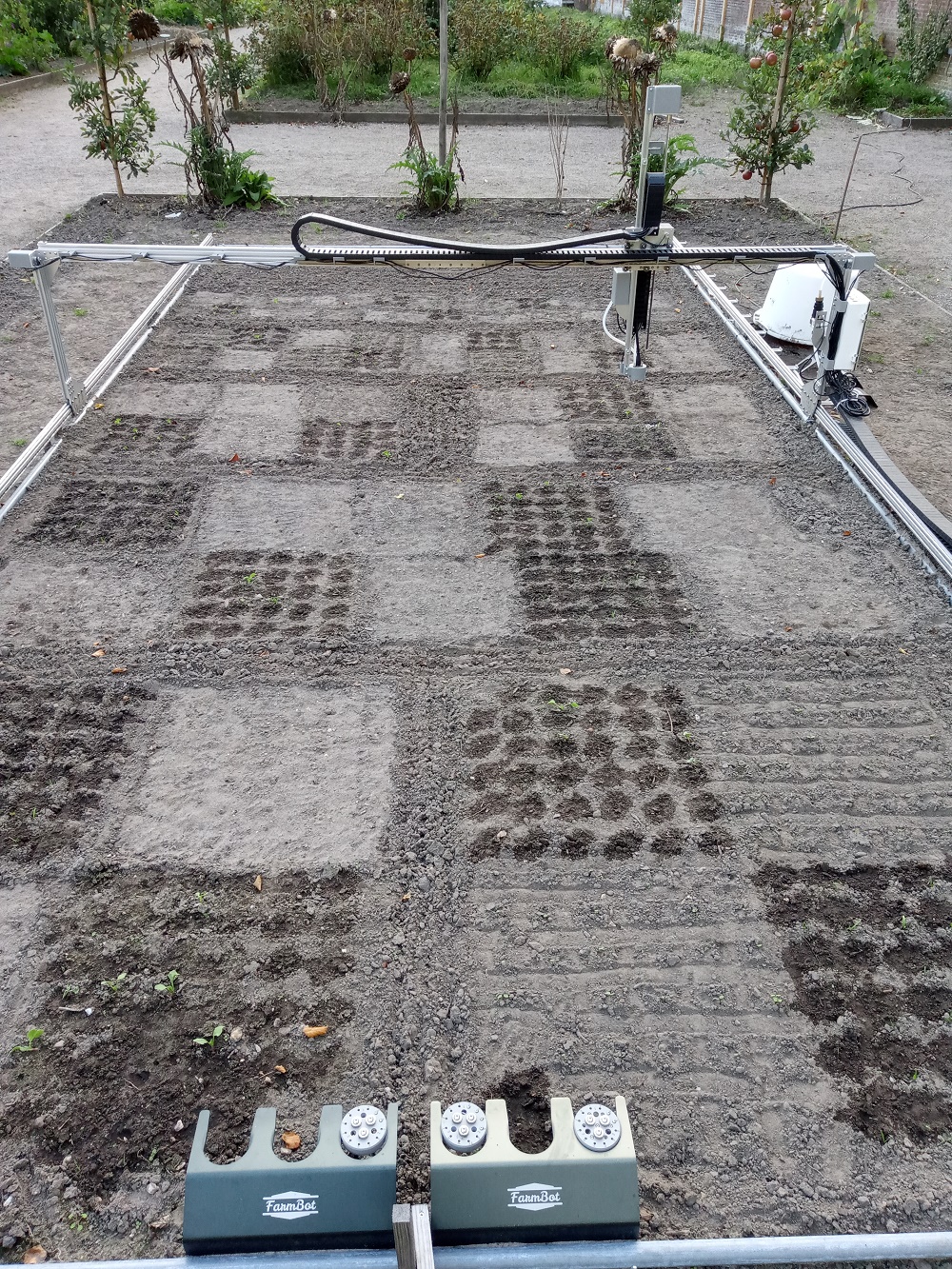 The Farming Systems Ecology group currently runs pixel cropping trials at three locations: on-station at WUR's Droevendaal Organic Experimental and Training Farm in Wageningen, and on-farm at Landgoed Zuylestein in Amerongen and at Landgoed Velhorst in Lochem. At Droevendaal, six different crops are grown in 50cm x 50cm pixels and allocated randomly within a fixed grid in two 9m x 12m plots. The random arrangement allows us to investigate the effect of a variety of neighbouring crops on the measured ecosystem services. At Zuylestein, we us a FarmBot XL to plant and tend pixels of multiple sizes and shapes in a 3m x 6m plot. Here we test "good" and "bad" crop combinations, determined through literature review. At Landgoed Velhorst, the farmer manages two 0.5ha plots containing pixels of 1.5m x 1.5m, chosen to accommodate the farmer's machinery. The planting pattern was designed in collaboration with the farmer. Using his experiential knowledge of which crop combinations do well together, we created optimal neighbourhoods which are replicated throughout the field. At present, the farmer is sowing more than 30 different crops in the pixel plots.