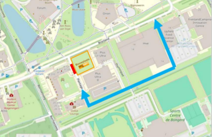 Doordat de Plantage is afgezet aan de kant van Campus Plaza, zal het verkeer via de aansluiting van de Plantage op Bronland bij Unilever/Flora Food Group (voorheen Upfield) worden geleid (zie plattegrond). In verband met de beperkte breedte laten verkeersregelaars het verkeer om en om toe op de Plantage. Volg hun aanwijzingen op voor een vlotte afhandeling en houd er rekening mee dat dit tot een langere reistijd kan leiden. Parkeer bij voorkeur elders op de campus wanneer je die dag bij het kinderdagverblijf (Prins Vleermuis), vaccinatiecentrum of Healthcare Hub moet zijn.
