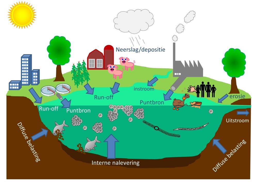 De overmaat aan voedingsstoffen in het water, ook wel eutrofiëring genoemd, is voor een groot deel veroorzaakt door erfenissen uit het verleden. Onderwaterbodems volgeladen met fosfaat kunnen herstel van meren en plassen met decennia vertragen. Dat noemen we interne eutrofiëring. Een andere erfenis is de verzadigde landbouwgrond, waardoor het vele jaren duurt voordat opgeslagen nutriënten via grondwater zijn afgevoerd naar het oppervlaktewater. Verder speelt depositie van stikstof via neerslag ook een rol.