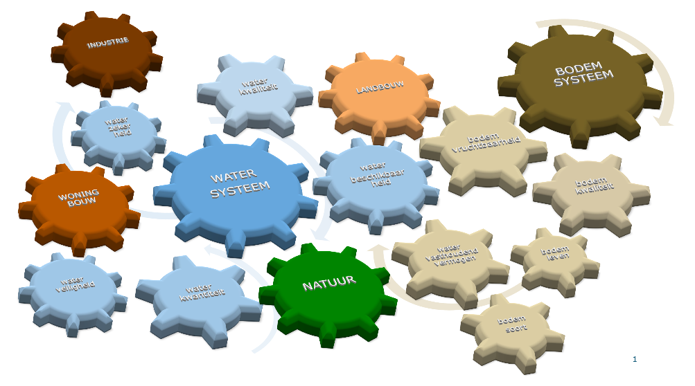 Het bodem-watersysteem dat Nederland nu heeft, is het resultaat van een wisselwerking tussen verschillende deelsystemen. Denk aan het reliëf in het landschap, de ondergrond, de bodem, het watersysteem, de ecologie en het landgebruik. Als je een goed beeld hebt van de onderlinge relaties hiertussen, kun je schetsen welke gevolgen veranderingen in één deelsysteem hebben op andere systemen.