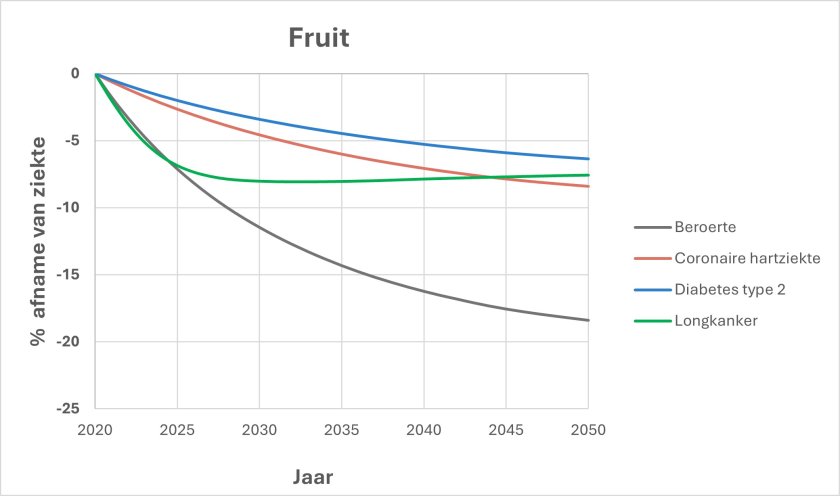 Nederland kan in 2050 ongeveer twintig procent minder nieuwe gevallen van zowel diabetes, coronaire hartziekten als beroertes tellen, als alle Nederlanders vanaf nu dagelijks twee stuks fruit eten en bewerkt vlees zoals worst en hamburgers laten staan. Dat blijkt uit onderzoek van Wageningen University & Research (WUR). De onderzoekers publiceerden hun bevindingen in het wetenschappelijke tijdschrift eClinicalMedicine.