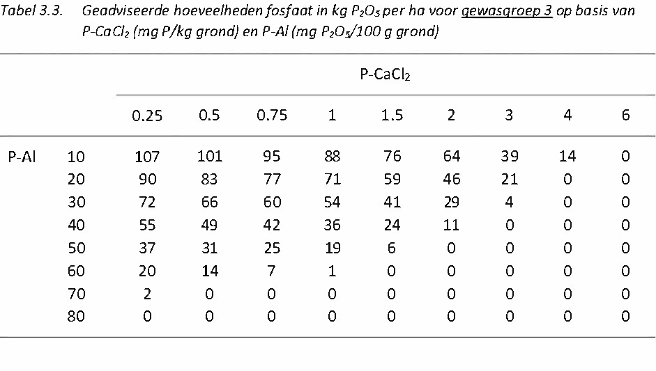 In de tabellen 3.0 t/m 3.4 zijn de fosfaatgiften vermeld die nodig zijn om gegeven de fosfaattoestand van de bodem op basis van P-AL en P-CaCl2 de economisch optimale opbrengst te bereiken met volvelds bemesting met fosfaat. Het advies op basis van deze beide indicatoren is onafhankelijk van grondsoort.