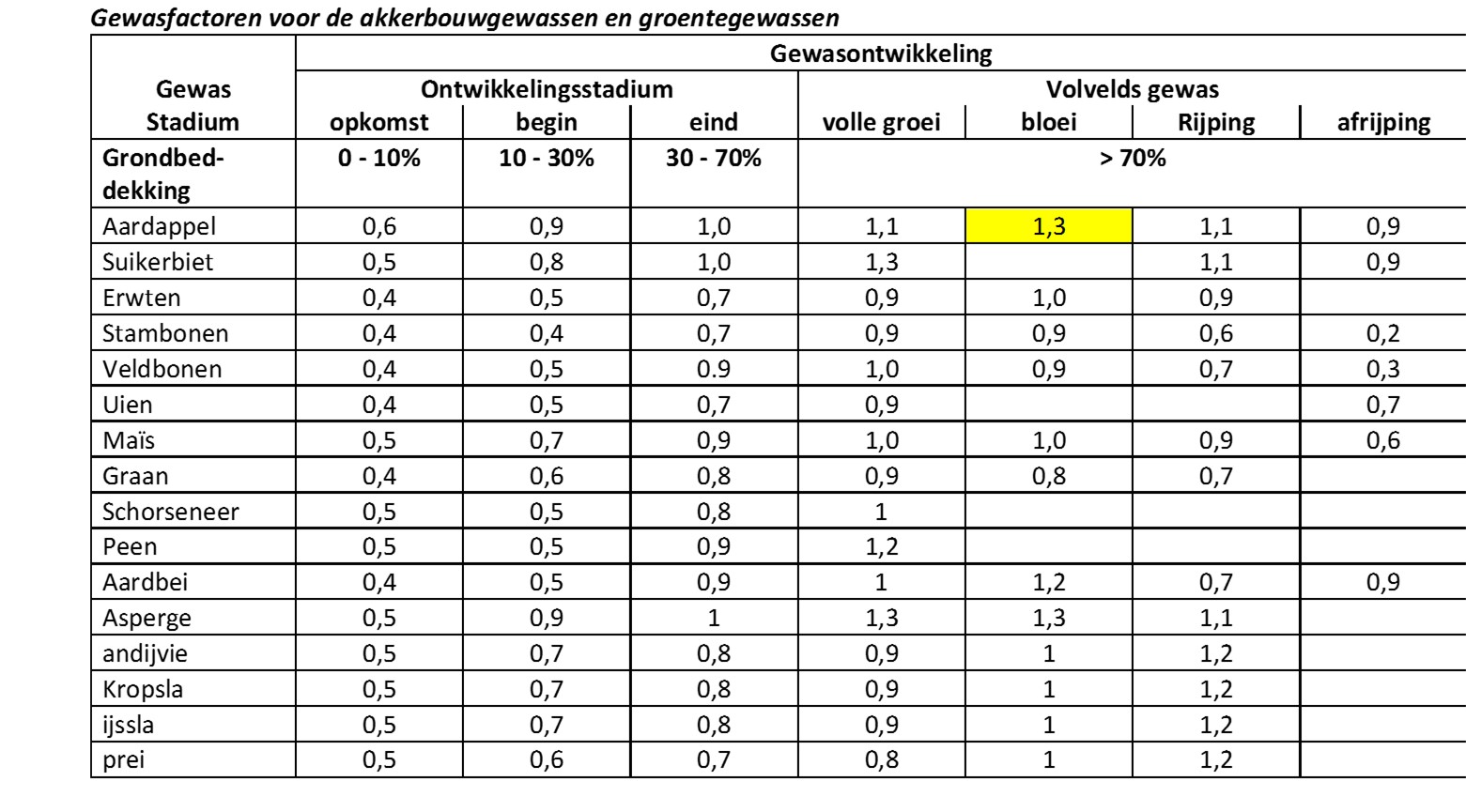 Stel vandaag is de referentieverdamping 5 mm (weerbericht). Uw aardappelgewas staat volvelds en is in bloei. De gewasfactor is dan 1,3 (zie onderstaande tabel). De actuele gewasverdamping is dan 5 x 1,3 = 6,5 mm/dag. Als u 30 mm water heeft beregend, er valt geen neerslag, en er is geen capillaire nalevering, dan is de beregende hoeveelheid na 4-5 dagen verdampt.